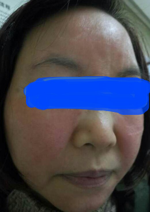 初诊:2017-1-13.因“颜面部皮肤红肿7年”就诊。7年前出现面部皮肤起疹子,如粟米状,潮红、瘙痒,自购治疗皮肤病的外擦剂,擦药后好转,停药后复发,曾经华西医院诊断为“血管扩张、玫瑰痤疮”,病情反复,迁延不愈。6个月前,“皮研所”诊断为“激素依赖性皮炎”经治疗病情仍无好转,患者痛苦异常,经多方打听,慕名于今日前来陈老处求治,刻下症:前额、两颊皮肤浮肿,颜色潮红,经太阳晒后加重,阵发性烧灼感。瘙痒,皮肤触之灼热、干燥、少许疹子,舌稍胖浅齿印稍瘀暗黄苔薄白脉弱。