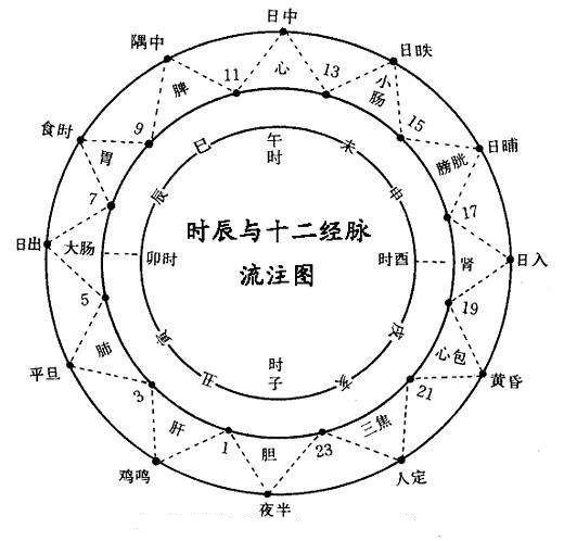 患者自诉凌晨五至七时腹胀为甚,以子午流注图示(如下图),昼则阳气在外,夜则阳气在内,一日之中,升降出入,阴阳循环,平旦则阳气始生,日出则阳气升,凌晨五至七点正日出之际,乃属手阳明大肠经主升,中焦虚寒,枢机不利,阳气欲升,与寒邪相争于中,故见此时腹胀尤甚。脾胃中焦枢纽,胃为阳土,素纳冷食,寒则伤阳,谷气不消,故见纳差;脾为己土,胃气不降,则脾气不升,经云:浊气在上则生瞋胀故腹胀;清气在下则生飧泄,故大便偏稀;脾胃后天之本,气血生化之源,脾胃纳谷无力,生化不足,形体失于濡养,故见面色少华、精神欠佳;母病及子,肺气不足,气不足以言,故言语低微;脾主四肢,四维相代,阳气乃绝,故四肢不温;肾为土之母,久病及肾,肾阳虚衰,肌肤失于温煦,不耐风寒,故见畏寒;冬则阳气闭藏,阴气用事,则畏寒怕冷加重;腰为肾之府,故见腰冷;膀胱气化不足,故见夜尿次数多;舌胖齿印、舌质偏瘀暗、脉沉弱皆为脾胃阳虚之证。