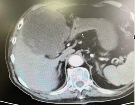 2022年10月26日复查腹部CT提示:肝右叶团块影,考虑感染性病变,目前病变略较前增大(大小约12.0*11.5*10.2cm)。