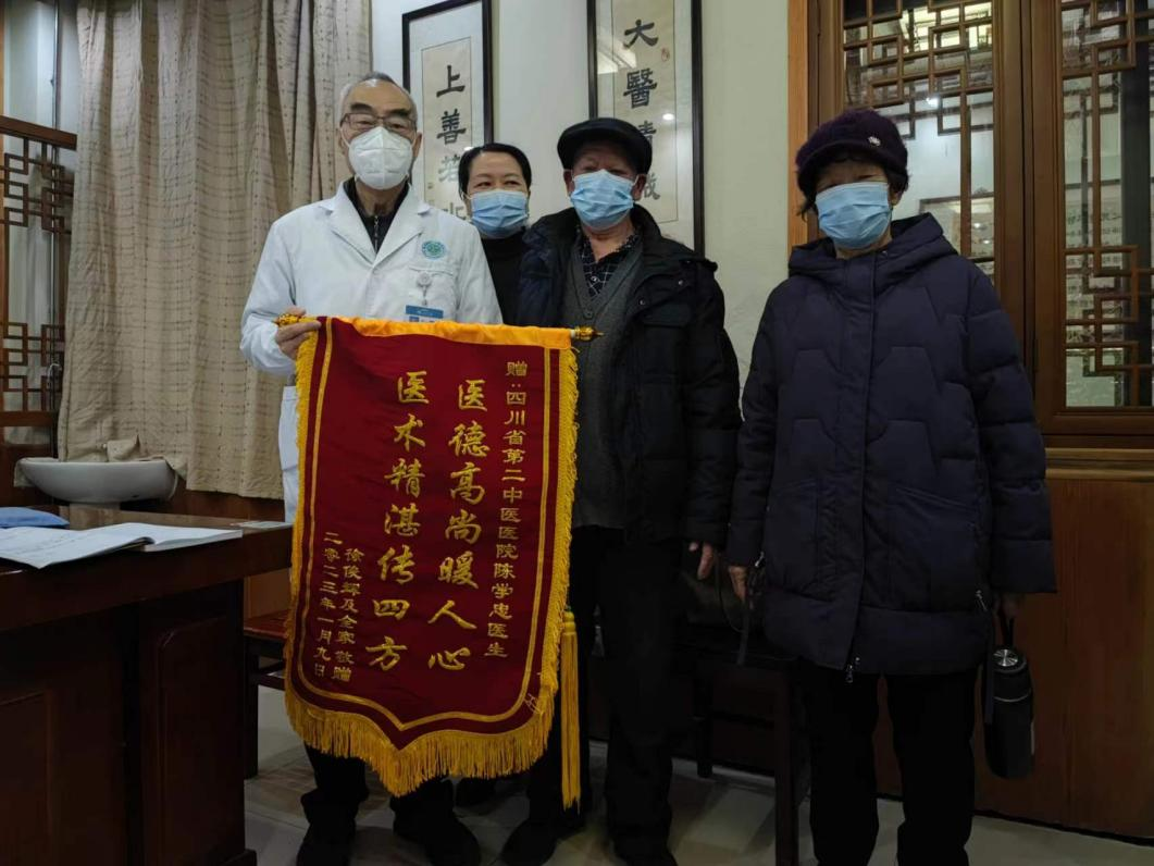 2023年1月11日,患者为表对陈学忠教授的感激以及进一步身体调理的需求,遂从新疆省石河子市至四川省第二中医医院陈学忠教授诊室复诊并为陈学忠教授送上锦旗。