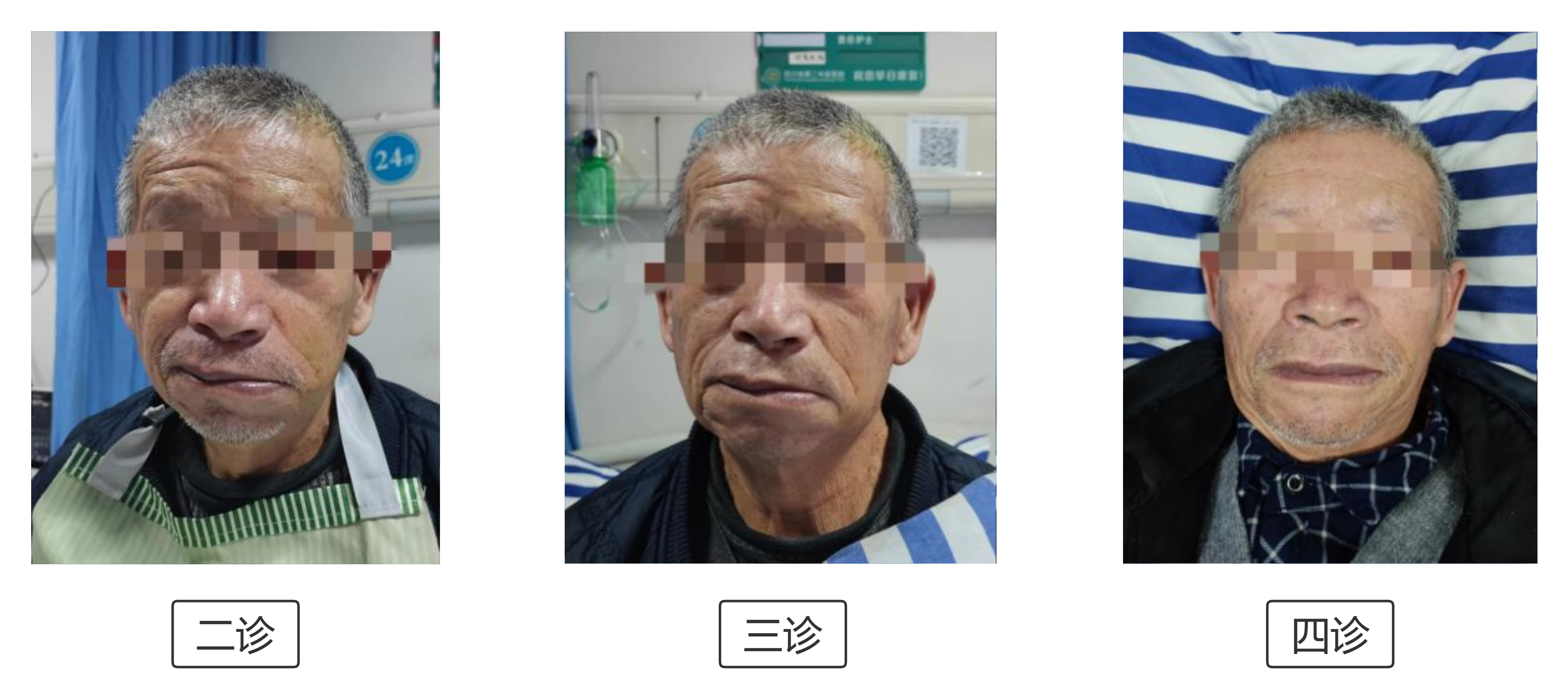 现病史:2+月前无明显诱因出现左侧额纹变浅,左侧眼睑下垂,闭合不全,左侧鼻唇沟变浅,口角向右侧㖞斜。患者遂于当地医疗机构诊治,行输液、中药、针灸等相关中西医治疗未见明显好转。