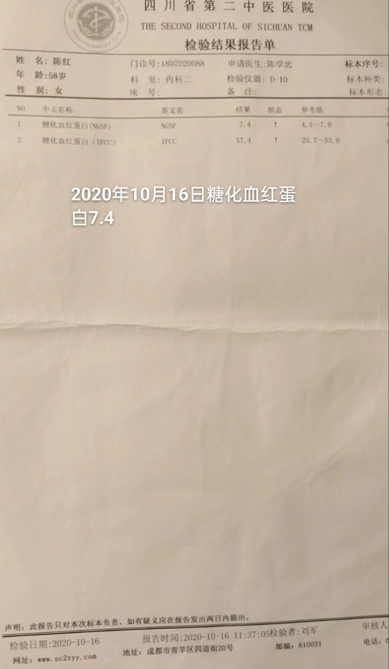 空腹血糖5.1,餐后6.5。身体不适感消。精神状态好,体重下降至57kg左右,口干完全消失。 |