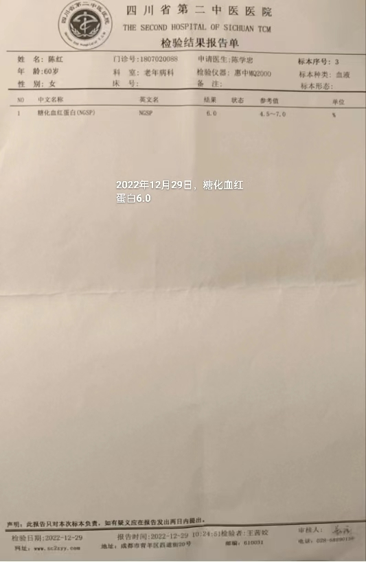 2022年3月、2022年7月、2022年12月检查血糖指数均正常,糖化血红蛋白6.0,甲功正常。