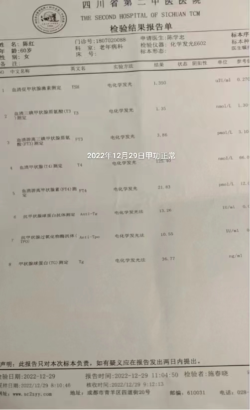 糖尿病西医发病机制尚未阐明,治疗强调降糖,控制血糖及并发症,但一般不能根治。甲状腺肿西医病因亦未完全阐明,因此尚无针对病因的治疗措施,目前对本病的治疗主要是控制高代谢症侯群,促进免疫监护正常化。本案例患者在未服用任何西药,且在停药相当长一段时间后血糖指数、甲功指数仍正常且稳定,不仅临床症状,身体机能也得到提高。通过患者的详细记录和检查报告,让我们对无西医干涉情况下的整个治疗过程和疗效可进行客观评价和比较,实践证明中医治疗糖尿病,配合饮食调整、体育锻炼确实对胰岛功能有改善,疗效显著、可靠。陈老擅长治疗各种疑难杂症和慢性、顽固性杂病,时常取得神奇疗效,不可胜数,为患者们带来了福音。