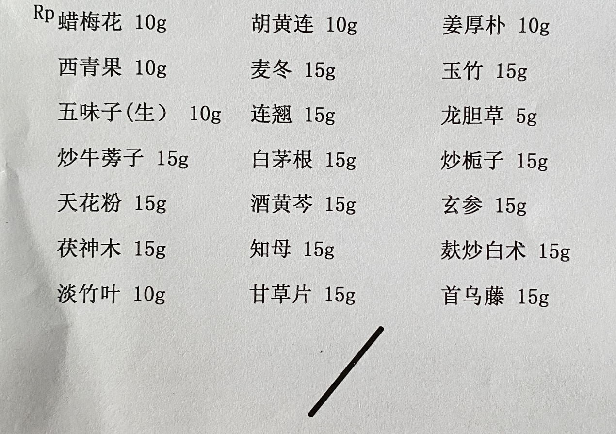 患者诉口腔疼痛好转约80%,饮食吞咽不觉疼痛,已能正常饮食,周身畅快,心情舒畅,仍有口干。刻下见:神清,精神佳,口腔疼痛进一步减轻,口腔溃疡基本已愈合,舌痛消失,口干减轻,纳眠尚可,二便调,故在上方基础上加山药30g、石斛20g固护脾胃之阴,继服3剂。