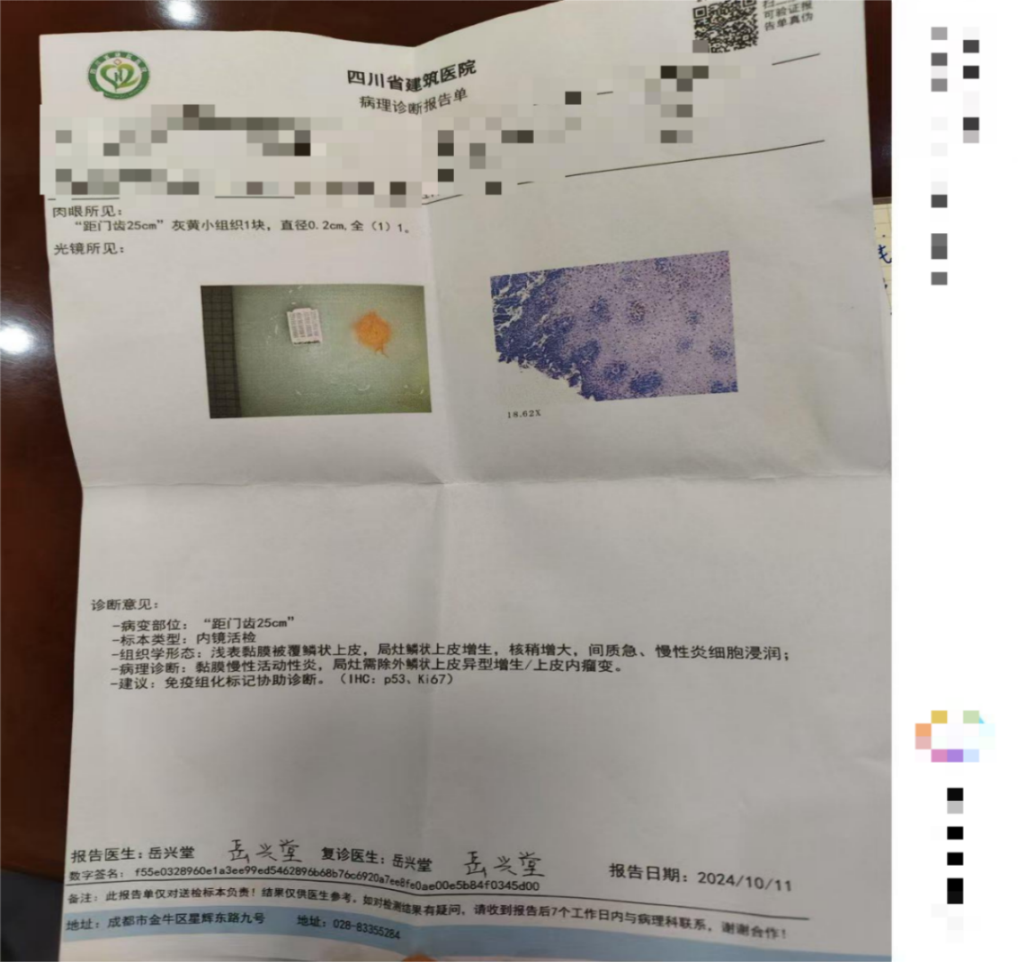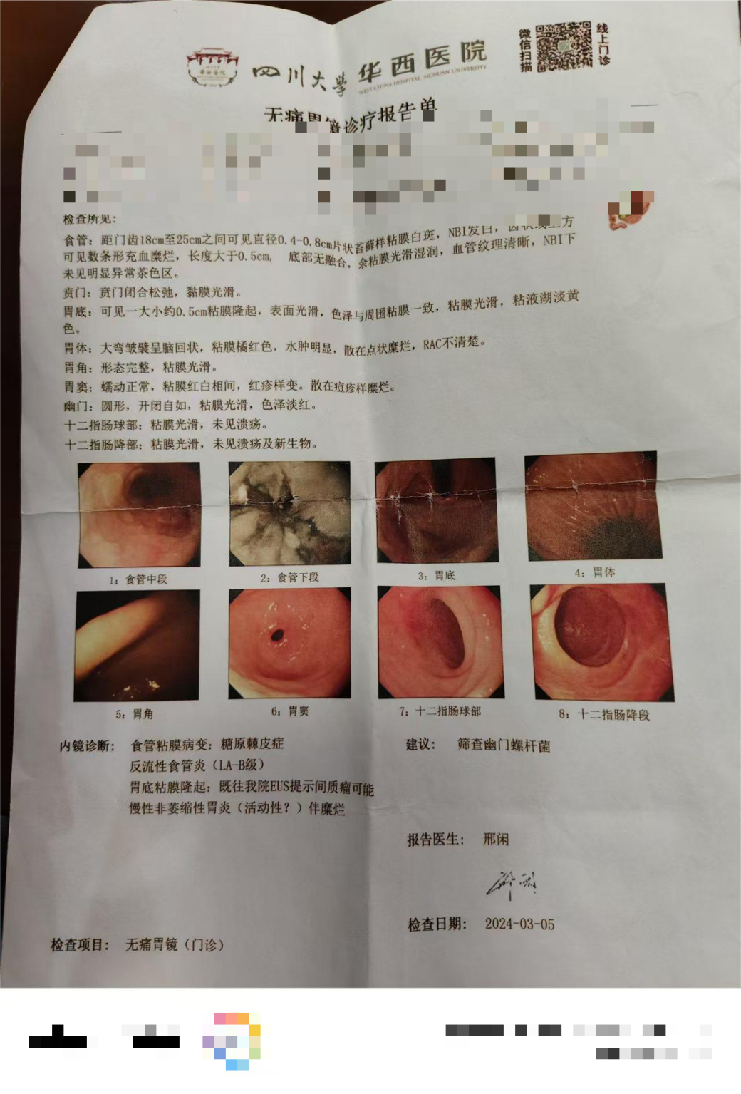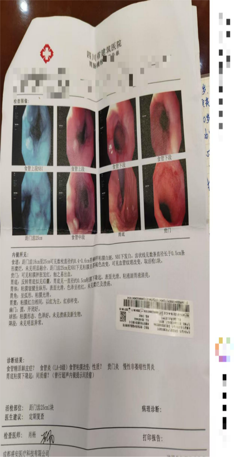 10月前,无明显诱因出现打嗝、自感胃酸灼痛,咽喉部疼痛加剧,平躺时疼痛不止,痛至影响睡眠,晨起疼痛未见明显缓解,遂至四川省华西医院就诊,行无痛胃肠镜检查(详情见附图),并与距门齿25cm处行病理切片(详情见附图),后反复辗转多处医疗机构就诊,症状均改善不明显,或改善后多次复发。