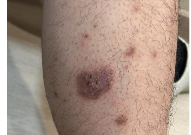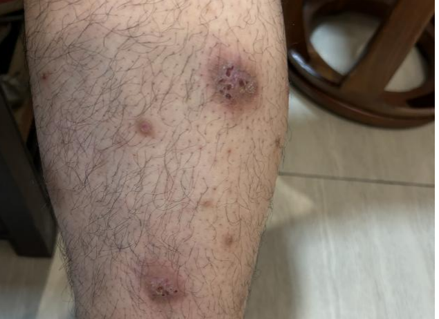 病史:患者2023年5月出现四肢散发湿疹,后用激素药物涂抹后好转,于2024年10月后反复,并于外院就诊诊断为“湿疹”“变应性皮炎”,服用中药后反而出现瘙痒情况加重,遂前往陈老处寻求诊治。就诊时患者四肢皮肤可见团状密集皮疹,凸起于皮肤,大小不等,红肿瘙痒,皮肤发硬,部分黄脓渗液,夜间明显,严重影响睡眠,饮食尚可,大小便正常。