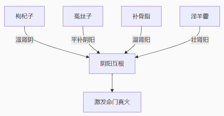 阴阳双调:枸杞滋阴济阳 + 补骨脂/淫羊藿温阳化气 → 符合张景岳“善补阳者,必于阴中求阳”